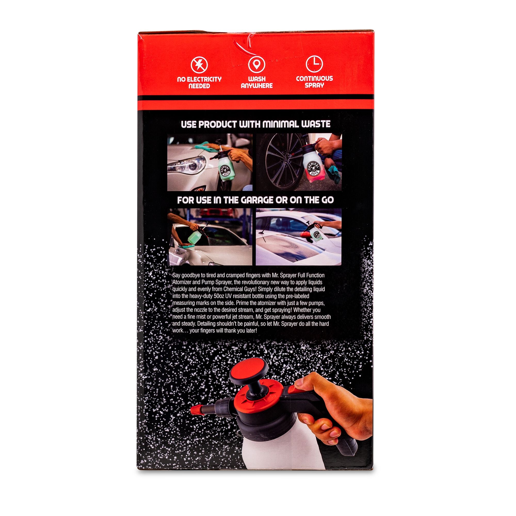 Mr. Sprayer is the revolutionary new way to apply detailing liquids without water hoses. buckets. power cords. or even tiring out your fingers. Just prime. point. and shoot a fine mist of product onto your vehicle.