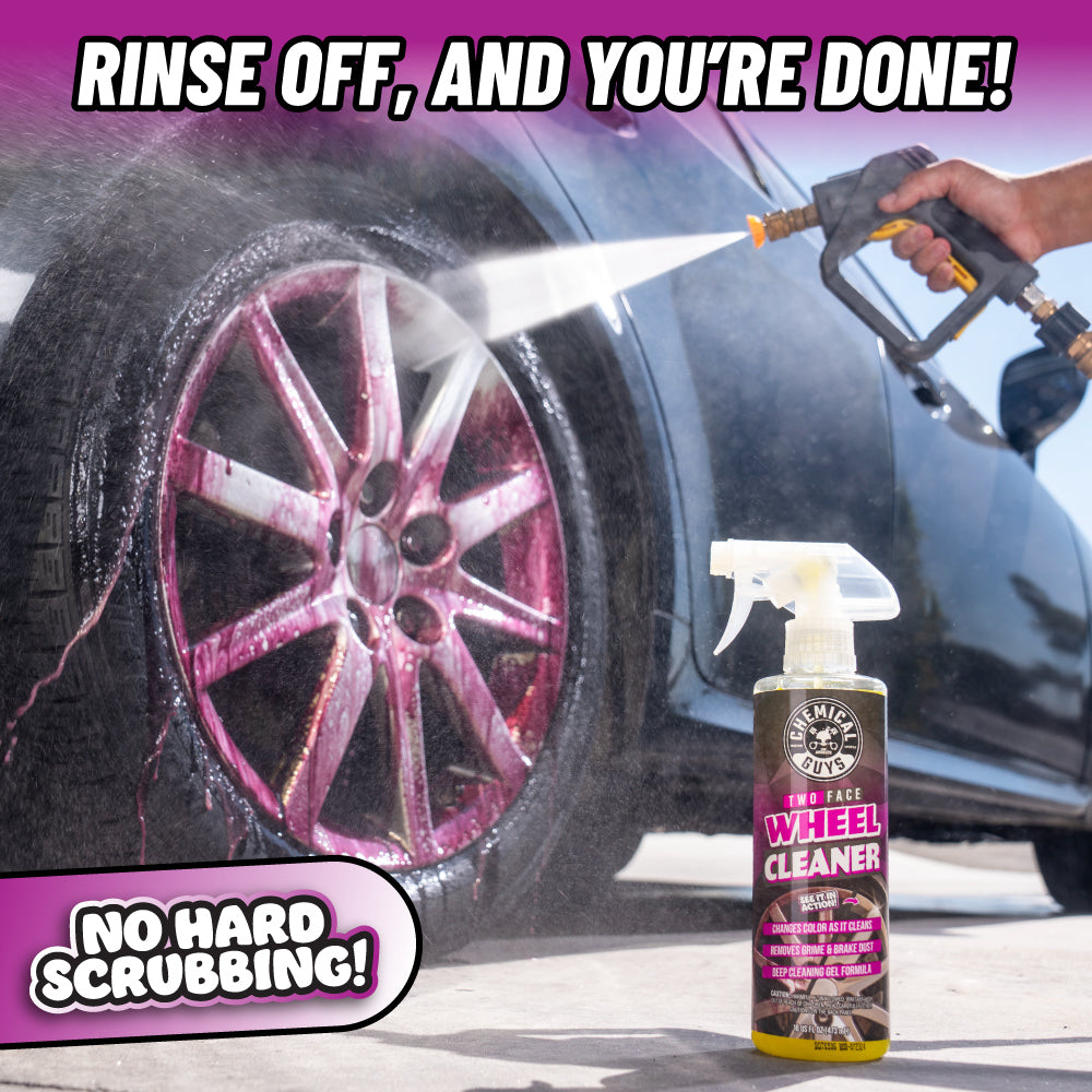 Say goodbye to hard scrubbing with Two Face Color Changing Wheel Cleaner. The easy-to-use gel formula changes colors as it works. clinging to wheels and using powerful agents to eliminate dirt. brake dust. and stubborn metallic buildup. Simply spray. wait for the color change. and rinse ?C no scrubbing required.